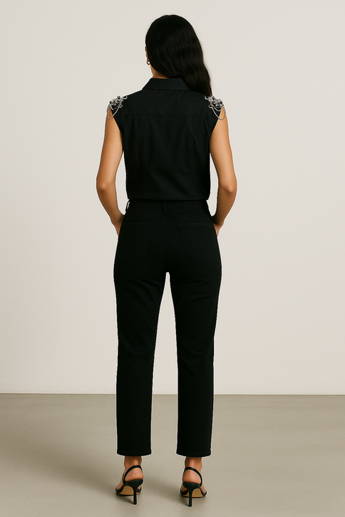 Designed with Chains beaded shoulder muscle pads, this button-up top effortlessly combines elegance and edge. The intricate beads on the shoulder add a touch of sophistication, making it a perfect statement piece.